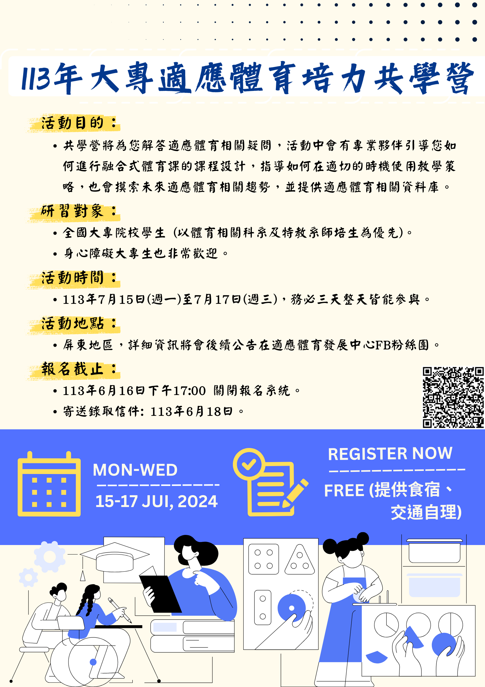 113年大專適應體育培力共學營-活動資訊如下 您知道什麼是適應體育嗎?您瞭解融合教育嗎?或是您在教學實習課上想設計融合式體育課程,但卻不知道如何下手嗎? 恭喜您!!!本次培訓營將會為您解答這些疑問,活動中會有專業夥伴引導您如何設計融合式課程,指導如何在適切的時機使用教學策略並實務教學,也提供您適應體育相關資料庫。 有這麼棒的活動,能不空出時間報名嗎!!! 名額有限,趕緊卡位!!! -填寫報名表:https://forms.gle/jmpGZnTZicESvGmZ6 -參與對象: 1.全國大專院校學生 (以體育相關科系及特教系師資培育生為優先)。 2.特殊需求大專生也非常歡迎。 -活動時間:113年7月15日(週一)至7月17日(週三) -活動地點: 屏東地區-國立屏東特教學校 -注意事項: 表單所提供資料僅作為”報名相關事宜使用,不會外流”。 -聯絡資訊: lac.ntnu@gmail.com ;02-7749-5301 李先生